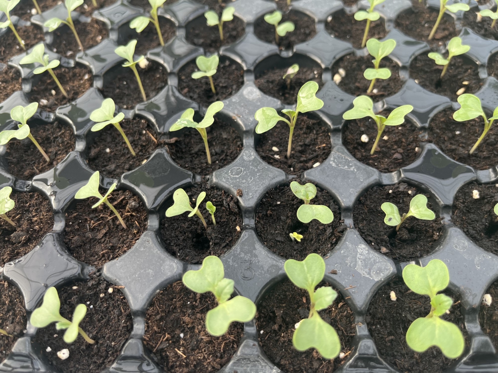 如照片所示,青花菜小粒種子與正常規格種子發育落差7天,圖中補植種子已發芽3天,而前7天播的小粒種子才剛發芽,明顯就能看到落差
